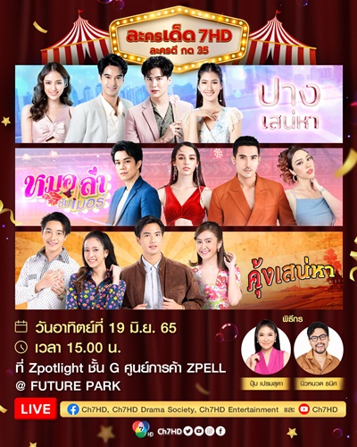 กลับมาแล้วจ้า ! ! หลังจากหายจากงานพบปะแฟน ๆ แบบ ON GROUND เนื่องด้วยสถานการณ์การแพร่ระบาดโควิด-19 แต่ล่าสุดช่อง 7HD พร้อมเตรียมส่งความสนุกให้แฟน ๆ ได้ใกล้ชิดกันเต็ม ๆ กับงานกิจกรรม “ละครเด็ด 7HD ละครดี กด 35” ยกทัพนักแสดงจากละคร 3 เรื่อง 3 รส ปางเสน่หา, หมอลำซัมเมอร์ และคุ้งเสน่หา มาพูดคุยและมีโชว์เด็ด ๆ มาให้ได้กรี๊ดกันสุดเสียง ใน วันอาทิตย์ที่ 19 มิถุนายนนี้ ! ณ ลาน Zpotlight ชั้น G ศูนย์การค้า สเปลล์ @ ฟิวเจอร์พาร์ค