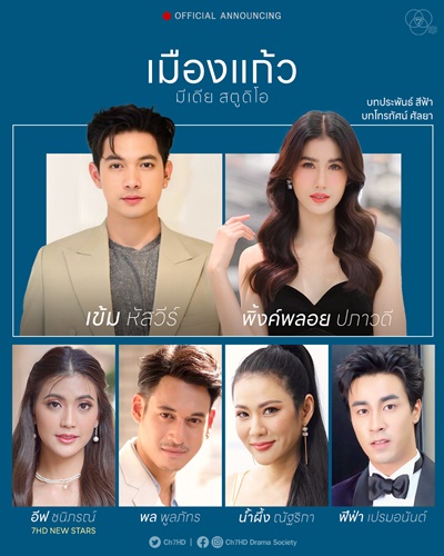 “เมืองแก้ว” จากบทประพันธ์ของ สีฟ้า บทโทรทัศน์จากปลายปากกา ศัลยา นำแสดงโดย เข้ม-หัสวีร์ ภัคพงษ์ไพศาล ประกบคู่ พิ้งค์พลอย - ปภาวดี ชาญสมอน เป็นครั้งแรก และนักแสดงมากฝีมือ น้ำผึ้ง-ณัฐริกา ธรรมปรีดานันท์, พล-พูลภัทร อัตถปัญญาพล ร่วมด้วย ฟีฟ่า-เปรมอนันต์ ศรีพานิช พร้อมขอแนะนำนักแสดงน้องใหม่จากโครงการ 7HD New Stars อีฟ-ชนิภรณ์ ทรัพย์มี