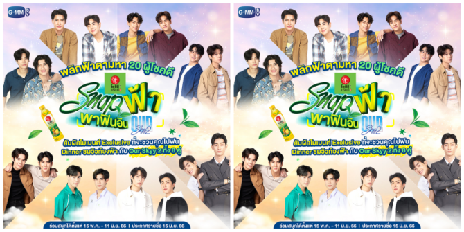 “โออิชิ” พลิกฟ้า!! ตามหา 20 ผู้โชคดีมาร่วมสัมผัสโมเมนต์สุดเอ็กซ์คลูซีฟกับ 16 นักแสดงในซีรีส์ “Our Skyy 2” จาก “GMMTV” คอนเทนต์โพรไวเดอร์ชั้นนำของเมืองไทย กับกิจกรรม “OISHI Snap ฟ้า พาฟินอิน Our Skyy 2” ที่ “โออิชิ กรีนที” แท็กทีม 16 นักแสดงจากซีรีส์ “Our Skyy 2” อาทิ เอิร์ท พิรพัฒน์, มิกซ์ สหภาพ / โอม ภวัต, นนน กรภัทร์ / เจมีไนน์ นรวิชญ์, โฟร์ท ณัฐวรรธน์ / ฟอส จิรัชพงศ์, บุ๊ค กษิดิ์เดช มาจัดกิจกรรมสุดพิเศษ แจกความสนุกสดชื่นกับกิจกรรมมากมาย ทั้งดินเนอร์มื้อพิเศษ ถ่ายรูปน่ารักๆ รับของที่ระลึกที่ไม่เหมือนใคร และโชว์พิเศษจากเหล่าศิลปิน ให้ 20 ผู้โชคดี 20 ได้มาฟิน อินไปด้วยกัน