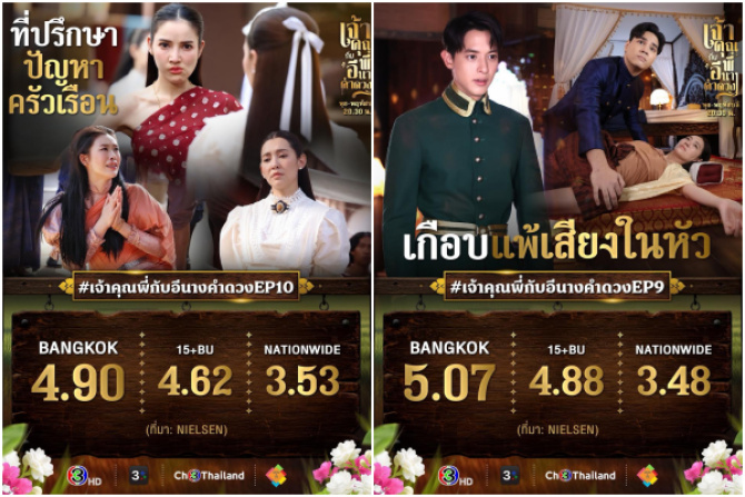 แม้คำดวงจะบอกความจริงซ้ำแล้วซ้ำ เล่า เลยส่งผลดันเรตติ้งขึ้นอย่ างสวยที่ 5.07 (กทม.) / 4.88 (15+BU) / 3.48 (ทั่วประเทศ) และยังไม่ทันหายขำ ความเข้มข้นก็ถาโถมใน EP10 เมื่อ “แม่ผกา”(แพท ณปภา) ต้องมาสวมบทที่ปรึกษาปั ญหาครอบครัวให้คำดวงหลังถูกยี่ สุ่นอดีตรักเก่าของขุนเอกตามรั งควานไม่เลิก จนทำให้ความสัมพันธ์ในบ้านสั่ นสะเทือน งานนี้แม่คำดวงเลยขอเอาคืน ไม่ยอมอยู่นิ่งอีกต่อไป! ส่งผลให้เรตติ้งยังแรงไม่ตกอยู่ ที่ 4.90 (กทม.) / 4.62 (15+BU) / 3.53 (ทั่วประเทศ)