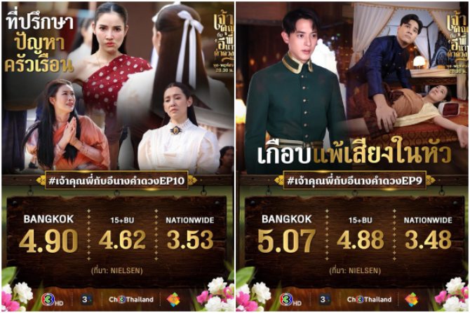 งานนี้คนดูหัวเราะกันไม่หยุด ขณะเดียวกันก็มีเสียงแอบหัวร้ อนอยากจะหยุมหัวขุนเอกกันทั้ งเมือง ที่ดันมอง “แม่ยี่สุ่น” (แบม สราลี) ว่ายังเป็นคนดีไม่เปลี่ยน แม้คำดวงจะบอกความจริงซ้ำแล้วซ้ำ เล่า เลยส่งผลดันเรตติ้งขึ้นอย่ างสวยที่ 5.07 (กทม.) / 4.88 (15+BU) / 3.48 (ทั่วประเทศ) และยังไม่ทันหายขำ ความเข้มข้นก็ถาโถมใน EP10 เมื่อ “แม่ผกา”(แพท ณปภา) ต้องมาสวมบทที่ปรึกษาปั ญหาครอบครัวให้คำดวงหลังถูกยี่ สุ่นอดีตรักเก่าของขุนเอกตามรั งควานไม่เลิก จนทำให้ความสัมพันธ์ในบ้านสั่ นสะเทือน งานนี้แม่คำดวงเลยขอเอาคืน ไม่ยอมอยู่นิ่งอีกต่อไป! ส่งผลให้เรตติ้งยังแรงไม่ตกอยู่ ที่ 4.90 (กทม.) / 4.62 (15+BU) / 3.53 (ทั่วประเทศ)