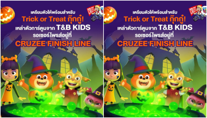 เตรียมต้อนรับปิดเทอมด้ วยความสนุกสุดหรรษาไปกั บบรรยากาศฮาโลวีนที่มาพร้อมเสี ยงหัวเราะและความทรงจำสุดพิเศษ! บริษัท T&B Media Global ขนขบวนเหล่าตัวแทนการ์ตูนขวั ญใจเด็กๆ จากภาพยนตร์และซีรีส์ชื่อดัง ไม่ว่าจะเป็น“Out of the Nest องครักษ์พิทักษ์เจี๊ยบ”, “Food Truckers ซอนนี่ เชฟป่วนก๊วนอร่อย”,“ FriendZSpace ก๊วน 3 ซ่า ตะลุยจักรวาล” และ “Shelldon หอยกู้โลก” มาสร้างสีสันและมอบความสุขให้กั บน้องๆ ในงาน CRUZEE X T&B KIDS BALANCE BIKE RACING Trick or Treat กุ๊กกู๋!