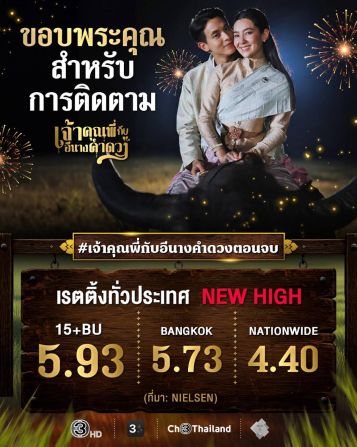 ปิดฉากอย่างงดงามและอบอุ่นหัวใจ สำหรับละครฟอร์มยักษ์แห่งปี “ เจ้าคุณพี่กับอีนางคำดวง” ทางช่อง 3 ฝีมือผู้จัดและกำกับของ วรวิทย์ ศรีสุภาพ ค่าย มัม แอนด์ อัส ที่ลาจอไปพร้อมเสียงฮื อฮาและคำชมล้นหลามโซเชียล กับความเข้มข้นของเนื้อเรื่ องผสมความโรแมนติกครบรส จนทำให้ตอนอวสานคว้าเรตติ้งสู งสุดทั่วประเทศถึง 4.40 ส่วนในพื้นที่กรุงเทพฯ พุ่งแตะ 5.73 และกลุ่มผู้ชม 15 BU+ (Bangkok & Urban) ฟาดเรตติ้งนิวไฮไปถึง 5.93 สร้างสถิติใหม่ให้กับละครไทยช่ วงไพร์มไทม์อีกครั้ง!
