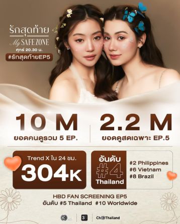 ขึ้นแท่นเฟมัสตัวแม่ไปแล้วจริง ๆ สำหรับซีรีส์ “รักสุดท้าย My Safe Zone The Series” ทางช่อง 3 ที่แฟน ๆ โดนตกไปทั่วบ้านทั่วเมืองกั บความน่ารักของสองสาว “ลีน่า ลลินา - หมิว ณัชชา” ด้วยฝีมือการแสดงที่ไม่เป็ นสองรองใครเก็บทุกรายละเอี ยดฉากเด็ดจนพาแฮชแท็ก #รักสุดท้ายEP5 ทะยานขึ้นติ ดเทรนด์ X ประเทศไทย และทำยอดดูสดเฉพาะ อีพี 5 สูงถึง 2.2 M ยอดคนดูรวม 10 M เป็นที่เรียบร้อยเป็นซีรีส์น้ำ ดีที่ยิ่งฉายยิ่งปังสมการรอคอย