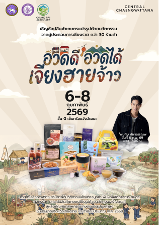 อย่าพลาด!!!! ช้อป ชิม สินค้าดาวเด่นจากจังหวัดเชียงรายในงาน “อวดดี อวดได้ เจียงฮายจ้าว”ระหว่างวันที่ 6-9 กุมภาพันธ์ 2569 เวลา 10.30 – 22.00 น. ณ บริเวณ ลานโปรโมชั่น PGA ชั้น G เซ็นทรัลแจ้งวัฒนะ อำเภอปากเกร็ด จังหวัดนนทบุรี