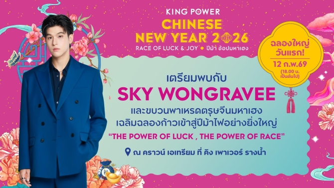 คิง เพาเวอร์ ชวนร่วมฉลองเทศกาลตรุษจีนต้อนรับพลังปีม้ามหาเฮงอย่างยิ่งใหญ่ ในงาน KING POWER CHINESE NEW YEAR 2026 RACE OF LUCK & JOY ปีม้า ช้อปมหาเฮง ปีนี้จัดเต็มด้วยความอลังการ พร้อมได้หนุ่มฮอตมากความสามารถ สกาย – วงศ์รวี นทีธร ผู้สืบทอดพลังแห่งมังกร ผู้นำความโชคดีสู่ปี 2569 นำทีมสร้างสีสันผ่านการแสดงพิเศษ “THE POWER OF LUCK POWER OF RACE SHOW ”