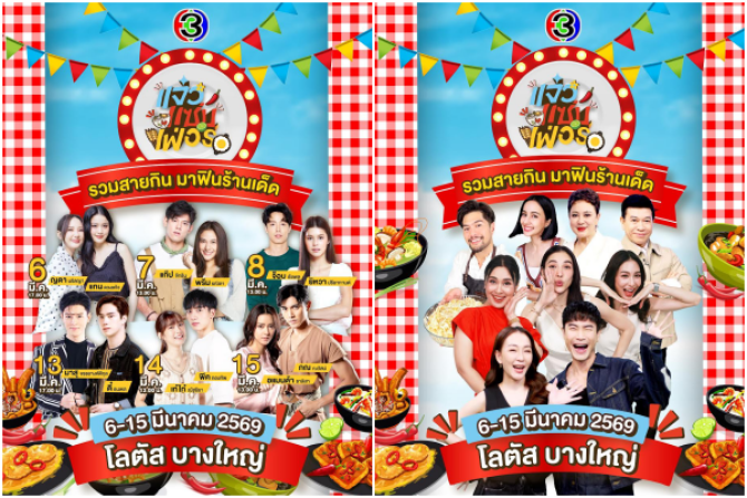 ของกินจัดจ้าน งานบันเทิงก็จัดเต็มไม่แพ้กัน! เมื่อนักแสดงตัวท็อปช่อง 3 ยกทัพมาเสิร์ฟความสุข ประเดิมวันศุกร์ที่ 6 มีนาคม เวลา 17.00 น. เปิดมหกรรมความอร่อยด้วย 2 นักแสดง แทน ดวงแก้ว และ ญดา นริลญา จากซีรีส์ Play Park รักไม่คาดฝัน ต่อด้วยวันเสาร์ที่ 7 มีนาคม เวลา 13.00 น. พบกับ พรีม รณิดา และ แก๊ป จักริน จากละคร ปิ่นอนงค์ ส่งต่อรอยยิ้มในวั