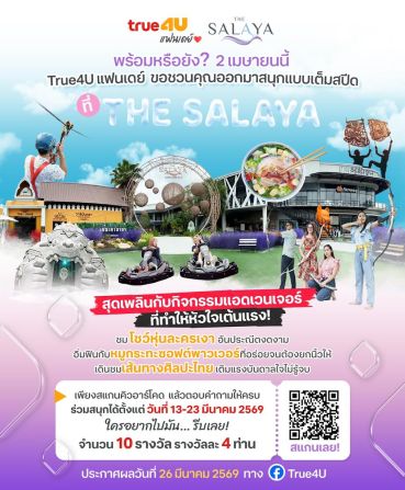 ภายในงาน ผู้เข้าร่วมจะได้เพลิดเพลินกั บประสบการณ์ครบทุกอารมณ์ ตั้งแต่กิจกรรมยิงธนูที่ท้ าทายความแม่น หรือซิปไลน์ที่พาโลดแล่นเหนื อแนวต้นไม้ในบรรยากาศสดชื่น พร้อมชมการแสดงหุ่นละครเงาไทยที่ สะท้อนเสน่ห์ทางวัฒนธรรม นอกจากนี้ยังมีหมูกระทะซอฟต์ พาวเวอร์ให้ได้อิ่มอร่ อยแบบสบายๆ ท่ามกลางพื้นที่สวน และยังสามารถเดินชมเส้นทางศิ ลปะที่เต็มไปด้วยผลงานสร้ างสรรค์ให้เก็บภาพประทับใจกลั บบ้าน ท่านผู้ชมสามารถเข้าร่วมกิ จกรรมได้ง่ายๆ เพียงสแกนคิวอาร์โค้ด และตอบคำถามตามเงื่อนไขที่กำหนด ตั้งแต่วันนี้ จนถึง 23 มีนาคม 2569 โดยจะคัดเลือกผู้เข้าร่วมกิ จกรรมจำนวน 10 รางวัล รางวัลละ 4 ท่าน ประกาศรายชื่อผู้ได้รับสิทธิ์ ในวันที่ 26 มีนาคม 2569 เวลา 11.00 น. ผ่านเฟชบุ๊ก True4U https://www.facebook.com/ share/p/1CbrG4eeim/ แล้ว.... เก็บกระเป๋าไปเที่ยวด้วยกัน 2 เมษายนนี้