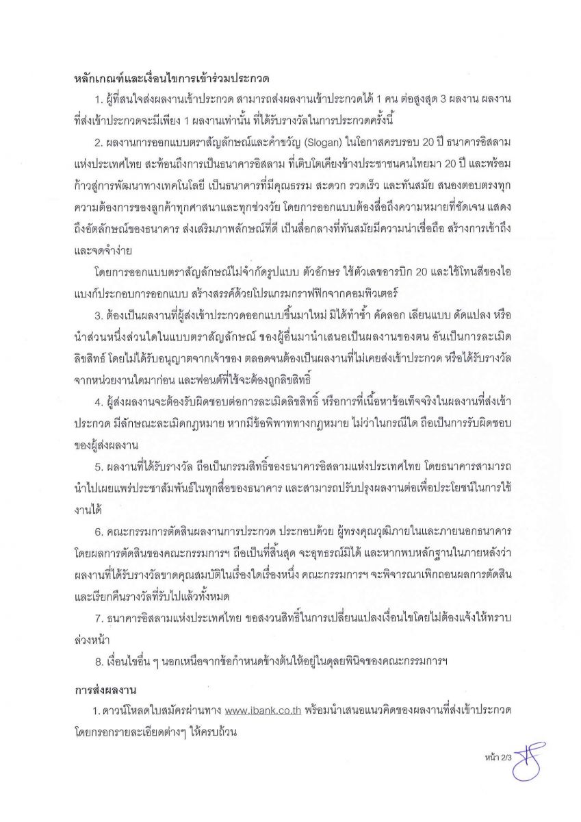 2. ผลงานการออกแบบตราสัญลักษณ์และคำขวัญ (Slogan) ในโอกาสครบรอบ 20 ปี ธนาคารอิสลามแห่งประเทศไทย สะท้อนถึงการเป็นธนาคารอิสลาม ที่เติบโตเคียงข้างประชาชนคนไทยมา 20 ปี และพร้อมก้าวสู่การพัฒนาทางเทคโนโลยี เป็นธนาคารที่มีคุณธรรม สะดวก รวดเร็ว และทันสมัย สนองตอบตรงทุกความต้องการของลูกค้าทุกศาสนาและทุกช่วงวัย โดยการออกแบบต้องสื่อถึงความหมายที่ชัดเจน แสดงถึงอัตลักษณ์ของธนาคารอิสลามแห่งประเทศไทย ส่งเสริมภาพลักษณ์ที่ดี เป็นสื่อกลางที่ทันสมัยมีความน่าเชื่อถือ สร้างการเข้าถึงและจดจำง่าย