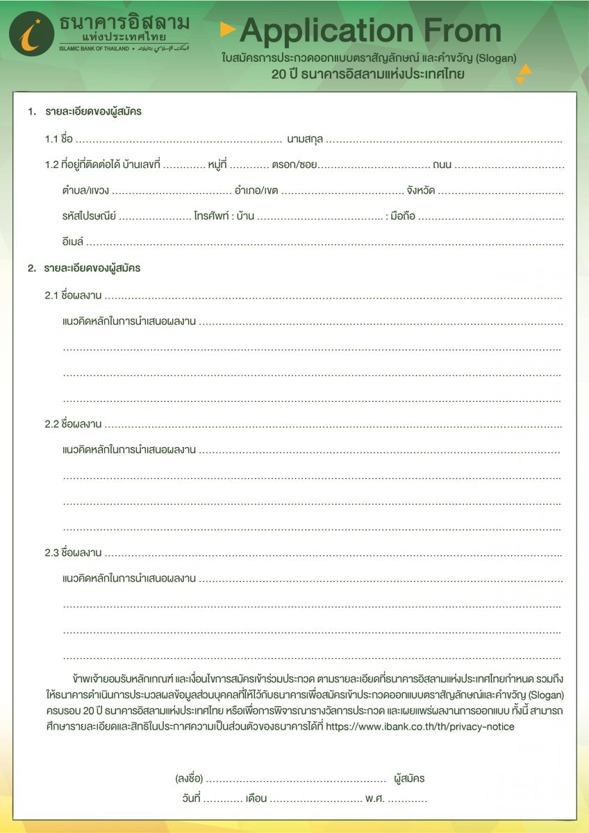 1. ดาวน์โหลดใบสมัครผ่านทาง www.ibank.co.th พร้อมนำเสนอแนวคิดของผลงานที่ส่งเข้าประกวด โดยกรอกรายละเอียดต่างๆ ให้ครบถ้วน