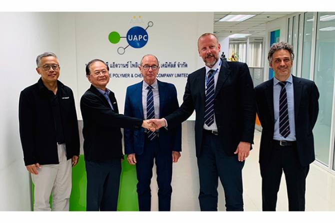 นายกิตติ ชีวะเกตุ ประธานกรรมการบริหาร พร้อมด้วย นายชัชพล ประสพโชค ประธานเจ้าหน้าที่บริหาร และกรรมการผู้จัดการ บมจ.ยูเอซี โกลบอล จำกัด (“UAC”) ร่วมด้วย Mr. Fabio Esposito Mr. Marco Medini และ Mr. Luca Vianelli ผู้บริหารกลุ่ม ICAP-SIRA จากประเทศอิตาลี เข้าทำสัญญาการโอนหุ้นบริษัท ยูเอซี แอ็ดวานซ์ โพลิเมอร์ แอนด์ เคมิคัลส์ จำกัด (“UAPC”) โดยกลุ่ม ICAP-SIRA เข้าถือหุ้น UAPC ในสัดส่วนร้อยละ 70 ของทุนจดทะเบียนซึ่งได้มีการเพิ่