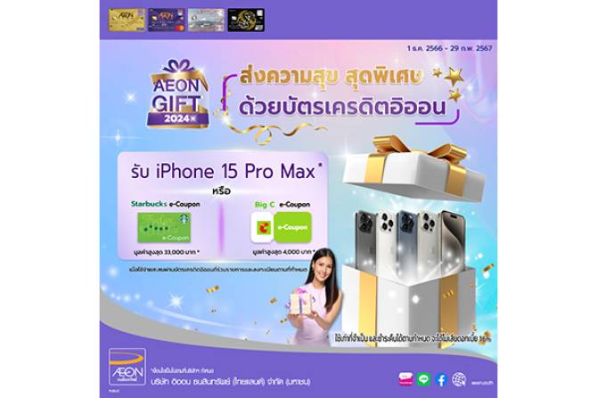 แคมเปญ AEON Gift 2024 มอบของขวัญแทนคำขอบคุณในความไว้วางใจที่ลูกค้าเลือกใช้บริการชำระเงินผ่านบัตรเครดิตอิออน เติมเต็มไลฟ์สไตล์ให้สุขยิ่งขึ้น ไม่ว่าจะเป็นช้อปปิ้ง รับประทานอาหาร ท่องเที่ยว หรือกิจกรรมไลฟ์สไตล์ที่คุณชอบ ผ่านบัตรเครดิตอิออนทุกประเภทที่ร่วมรายการ ณ ร้านค้าทั่วโลก ตามเงื่อนไขที่กำหนด* รับฟรี iPhone 15 Pro Max (512GB) เมื่อมียอดใช้จ่ายสะสม 5,000,000 บาทขึ้นไป หรือ iPhone 15 Pro (256GB) ยอดใช้จ่ายสะสม 4,000,000 บาทขึ้นไป หรือ Starbucks e-Coupon สูงสุดไม่เกิน 33,000 บาท เมื่อมียอดใช้จ่ายสะสม 1,000,000 บาทขึ้นไป หรือ Big C e-Coupon สูงสุดไม่เกิน 4,000 บาท เมื่อมียอดใช้จ่ายสะสม 50,000 บาทขึ้นไป โดยจำกัดสิทธิ์ของกำนัลหนึ่งสิทธิ์/ บัญชีบัตรหลัก/ ตลอดระยะเวลารายการส่งเสริมการขาย