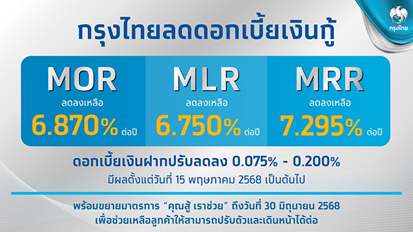 -อัตราดอกเบี้ยสำหรับลูกค้ารายย่อยชั้นดี (MRR) ปรับลดลงจากปัจจุบัน 7.345% ต่อปี เป็น 7.295% ต่อปีธนาคารให้ความสำคัญกับการดูแลช่วยเหลือลูกค้าทุกกลุ่มให้สามารถปรับตัว และสร้างโอกาสจากการเปลี่ยนแปลงที่เกิดขึ้นได้ โดยออกมาตรการความช่วยเหลือลูกค้ามาอย่างต่อเนื่อง ทั้ง มาตรการช่วยเหลือลูกค้าที่ได้รับผลกระทบจากเหตุการณ์แผ่นดินไหว มาตรการช่วยเหลือผู้ประสบภัยน้ำท่วม อีกทั้ง ยังร่วมขับเคลื่อนการแก้ไขปัญหาหนี้ครัวเรือน ผ่านสินเชื่อรวมหนี้ข้าราชการยั่งยืน สินเชื่อกรุงไทยรวมหนี้ (ภาคประชาชน) และ สินเชื่อกรุงไทยบ้านแลกเงิน ที่ช่วยให้ลูกค้าเข้าถึงสินเชื่อดอกเบี้ยต่ำ ลดภาระทางการเงิน เสริมสภาพคล่องการทำธุรกิจและเพิ่มความคล่องตัวในการดำรงชีพ ตามแนวทางการให้สินเชื่ออย่างรับผิดชอบและเป็นธรรม (Responsible Lending) ของธนาคารแห่งประเทศไทย โดยล่าสุด ได้ขยายมาตรการ “คุณสู้ เราช่วย” จนถึงวันที่ 30 มิถุนายน 2568 จากเดิมสิ้นสุดวันที่ 30 เมษายน 2568 เพื่อช่วยเหลือลูกค้ากลุ่มเปราะบาง ทั้งรายย่อยและ SME ให้สามารถปรับตัวและเดินหน้าต่อไปได้อย่างยั่งยืน