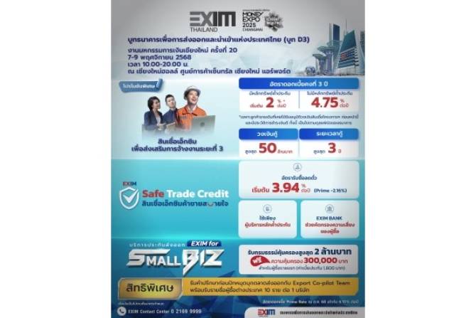 ธนาคารเพื่อการส่งออกและนำเข้าแห่งประเทศไทย (EXIM BANK) จัดเต็มบริการทางการเงิน พร้อมโปรโมชันพิเศษ ในงานมหกรรมการเงินเชียงใหม่ ครั้งที่ 20 (Money Expo 2025 Chiang Mai) ระหว่างวันศุกร์ที่ 7-วันอาทิตย์ที่ 9 พฤศจิกายน 2568 ณ บูท D3 เชียงใหม่ฮอลล์ ศูนย์การค้าเซ็นทรัล เชียงใหม่ แอร์พอร์ต ภายใต้แนวคิด “Empowering Toward a Sustainable Wealth เสริมพลัง เพื่อสร้างความมั่งคั่งอย่างยั่งยืน”