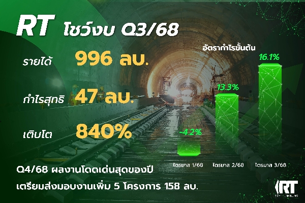 RT เผยผลประกอบการไตรมาส 3/68 ฟื้นตัวต่อเนื่อง รายได้รวม 996 ล้านบาท กำไรสุทธิ 47 ล้านบาท โต 840% ทิศทางธุรกิจไตรมาส 4/68 คาดผลงานโดดเด่นที่สุดของปี เตรียมส่งมอบ 5 โครงการ มุ่งเพิ่มศักยภาพการดำเนินงาน เพิ่มความสามารถการทำกำไร