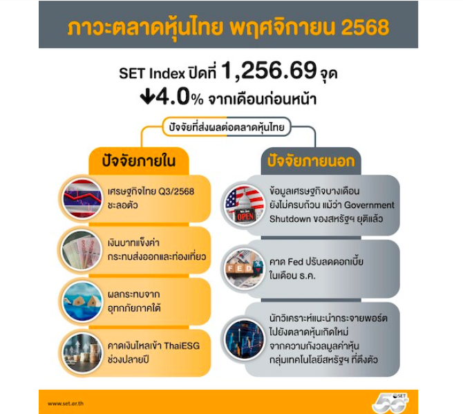 สำหรับตลาดหุ้นไทย ดัชนี SET Index ในเดือนพฤศจิกายน 2568 ลดลง 4.0% จากสิ้นเดือนก่อนหน้า มาปิดที่ 1,256.69 จุด สอดคล้องกับการเคลื่ อนไหวของตลาดหุ้นโลก และยังได้รั บผลกระทบจากการชะลอตั วของเศรษฐกิ จไทยในไตรมาสสามของปี 2568 และสถานการณ์อุทกภัยภาคใต้