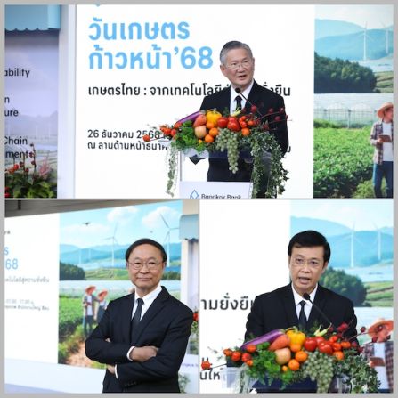 นายพิเชฐ ดุรงคเวโรจน์ กรรมการบริหาร ธนาคารกรุงเทพ จำกัด (มหาชน) กล่าวว่า ธนาคารกรุงเทพ มุ่งมั่นสนับสนุน และผลักดันภาคการเกษตรไทยอย่ างต่อเนื่องตลอดระยะเวลากว่า 81 ปี ซึ่งงานมหกรรมจำหน่ายสินค้า วันเกษตรก้าวหน้า’ 68 นี้ จัดขึ้นเพื่อยืนยันเจตนารมณ์ ของธนาคารที่จะเป็น “เพื่อนคู่คิด มิตรคู่บ้าน” สนับสนุนและอยู่เคียงข้างให้ เกษตรกรไทยสามารถพัฒนาอย่างยั่ งยืน พร้อมทั้งเปิดโอกาสให้ ภาคเกษตรไทยได้ก้าวสู่เวที โลกอย่างมั่นคง ด้วยองค์ความรู้ที่ทันสมัย โดยให้ความสำคัญกับประเด็น การเพิ่มผลผลิตและลดความเสี่ ยงด้วยเกษตรแม่นยำ (Precision Agriculture) ซึ่งสามารถช่วยลดต้นทุนปุ๋ ยและยาได้ 15–40% และเพิ่มผลผลิตได้ถึง 10–30% การพัฒนาคุณภาพผลผลิตให้ได้ มาตรฐานสากล เช่น มาตรฐาน GAP Organic Carbon footprint การแปรรูปนวัตกรรม (Agro-processing Innovation) เช่น ถนอมอาหารด้วยนวัตกรรม Food Tech การใช้เครื่องจักรต้นทุนต่ำ ในระดับชุมชน การส่งเสริมตลาดและราคาด้ วยแพลตฟอร์มดิจิทัล เช่น การใช้ AI วิเคราะห์ราคา-ความต้องการ การตรวจสอบย้อนกลับกระบวนการผลิ ตและการจัดจำหน่าย (Traceability) ผ่าน Blockchain และการใช้นวัตกรรมเทคโนโลยีชี วภาพ (Biotech) เพื่อเพิ่มผลผลิตอย่างมีประสิ ทธิภาพ เช่น พันธุ์พืชทนแล้ง ทนโรค และสามารถนำวัสดุเหลือทิ้ งทางเกษตรกลับมาใช้ประโยชน์เพื่ อลดขยะ ซึ่งเป็นนโยบายและแนวทางที่ ประชาคมโลกให้ความสำคัญ ลดการปล่อยก๊าซเรื อนกระจกในภาคการเกษตร จนไปสู่ Zero waste ในที่สุด