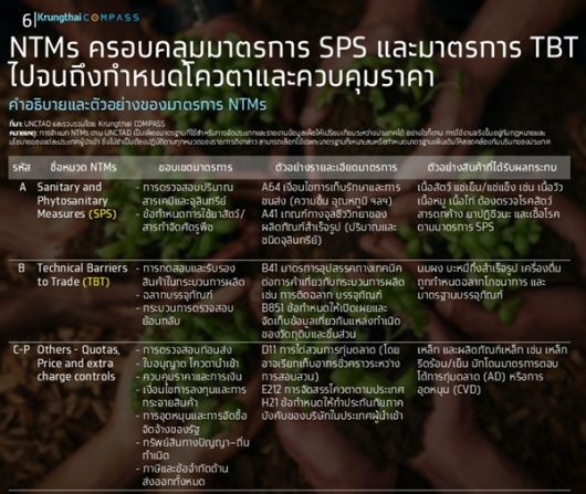 ศูนย์วิจัย Krungthai COMPASS ชี้ มาตรการทางการค้าที่มิใช่ภาษี (Non-Tariff Measures: NTMs) กำลังเป็นอุปสรรคสำคัญในการค้าโลก โดยเฉพาะในกลุ่มสินค้าเกษตรและอาหาร ซึ่งคาดว่าจะกระทบตลาดส่งออกไทยกว่า 6 แสนล้านบาท หรือคิดเป็นราว 33% ของมูลค่าส่งออกสินค้าเกษตรและอาหารทั้งหมดของไทย แนะผู้ประกอบการ 3 กลุ่มหลัก ได้แก่ เนื้อสัตว์แปรรูป อาหารทะเลแปรรูป และผักและผลไม้ เร่งยกระดับมาตรฐานด้านสุขอนามัย เช่น การปนเปื้อนสารเคมีและสารตกค้าง อย่างจริงจัง และนำเทคโนโลยีดิจิทัลมาใช้ตรวจสอบย้อนกลับ เพื่อเพิ่มขีดความสามารถในการแข่งขันในตลาดโลก