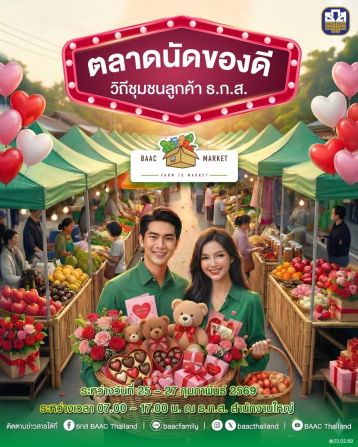 ธ.ก.ส. ส่งท้ายเดือนแห่งความรักด้วยตลาดนัดของดีวิถีชุมชน ภายใต้ธีม “เดือนแห่งความรัก Month of Love” ที่นำสินค้าเกษตรและผลิตภัณฑ์ชุมชนแบบติดแกลมจากเกษตรกรลูกค้าทั่วประเทศกว่า 60 ร้านค้า มาให้เลือกซื้อเพื่อมอบให้คนพิเศษ นอกจากนี้ยังมีโซนอาหาร เครื่องดื่ม และถ่ายภาพเช็กอินกับโฟโต้บุ๊ค ระหว่างวันที่ 25 - 27 กุมภาพันธ์ 2569 ณ บริเวณด้านหน้า ธ.ก.ส. สำนักงานใหญ่ กรุงเทพฯ