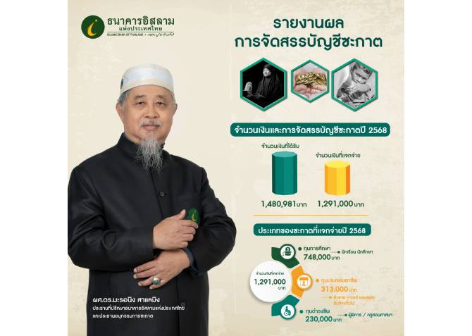 ดร.มะรอนิง สาแลมิง ประธานที่ปรึกษาและประธานอนุกรรมการซะกาต ธนาคารอิสลามแห่งประเทศไทย (ไอแบงก์) เผยว่า มติที่ประชุมคณะอนุกรรมการซะกาต ครั้งที่ 1/2569 เมื่อวันที่ 21 มกราคม 2569 ที่ผ่านมา ได้สรุปผลการดำเนินงานการบริหารจัดการบัญชีซะกาตของธนาคารในปี 2568 ที่ผ่านมา ซึ่งได้ช่วยเหลือผู้มีสิทธิ์รับซะกาตทั่วประเทศ จำนวน 238 ราย รวมเป็นเงินทั้งสิ้น 1,291,000 บาท ซึ่งประกอบด้วย