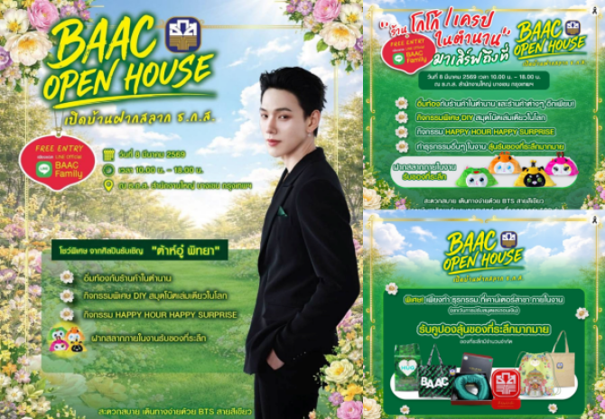 ธนาคารเพื่อการเกษตรและสหกรณ์การเกษตร (ธ.ก.ส.) ชวนร่วมงานเปิดบ้านฝากสลาก ธ.ก.ส. กับกิจกรรม BAAC Open House เพื่อเปิดประสบการณ์คนเมืองในการสร้างเสริมพฤติกรรมการออมเงิน ผ่านเงินฝากและสลากออมทรัพย์ ธ.ก.ส. โดยภายในงานมีบูธให้บริการทางการเงินจาก ธ.ก.ส. ได้แก่ การรับฝากสลากออมทรัพย์ ธ.ก.ส. ชุดกระพ้อมทอง หน่วยละ 500 บาท ลุ้นโชคใหญ่ 20 ล้านบาท และรางวัลอื่น ๆ รวมมูลค่ากว่า 86 ล้านบาทต่อเดือน จำนวน 24 ครั้ง เมื่อฝากครบ 2 ปี ได้รับดอกเบี้ยหน่วยละ 3 บาท และชุดกระพ้อมเงิน หน่วยละ 100 บาท ลุ้นรางวัลใหญ่ 10 ล้านบาท ที่มาพร้อมรางวัลพิเศษอีกรางวัลละ 1 ล้านบาท ปีละ 3 ครั้ง รวม 30 ล้านบาท และรางวัลอื่น ๆ รวมมูลค่ากว่า 109 ล้านบาทต่อเดือน จำนวน 24 ครั้ง ฝากครบ 2 ปี รับดอกเบี้ยหน่วยละ 0.25 บาท พร้อมโปรโมชันสุดพิเศษเฉพาะในงาน ได้แก่ เมื่อฝากสลากออมทรัพย์ชุดใดก็ได้ จำนวน 20,000 บาท รับหมอนผ้าห่ม Agri Animal จำนวน 1 ชิ้น คละแบบ เมื่อฝากสลากฯ 50,000 บาท รับหมอนผ้าห่ม Agri Animal จำนวน 2 ชิ้น คละแบบ และเมื่อฝากสลากฯ 1,000,000 บาท รับหมอนผ้าห่ม Agri Animal จำนวน 4 ชิ้น ครบเซ็ต ไม่ซ้ำแบบ เพียงทำธุรกรรมที่เคาน์เตอร์สาขาภายในงาน (ยกเว้นการปรับสมุดและถอนเงิน) รับคูปองลุ้นของที่ระลึกจาก ธ.ก.ส. สุด Limited Edition มากมาย