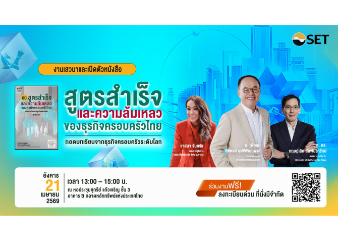 ตลาดหลักทรัพย์แห่งประเทศไทย ชวนเจ้าของกิจการ ทายาทธุรกิจ และผู้ที่สนใจ ร่วมงานเสวนาและเปิดตัวหนังสือ “สูตรสำเร็จและความล้มเหลวของธุรกิจครอบครัวไทย: ถอดบทเรียนจากธุรกิจครอบครัวระดับโลก” ในวันอังคารที่ 21 เมษายน 2569 เวลา 13.00-15.00 น. ณ ตลาดหลักทรัพย์ฯ เพื่อเจาะลึกเคล็ดลับความสำเร็จ พร้อมเรียนรู้จากบทเรียนจริงของธุรกิจครอบครัวระดับโลกหลากหลายมิติ นำมาใช้เป็นแนวทางวางรากฐานบริหารธุรกิจครอบครัวให้เติบโตอย่างยั่งยืนจากรุ่นสู่รุ่น ผ่านมุมมองจากวิทยากรผู้ทรงคุณวุฒิระดับแนวหน้า นำโดย ศาสตราจารย์พิเศษ กิติพงศ์ อุรพีพัฒนพงศ์ ประธานกรรมการ ตลาดหลักทรัพย์ฯ และ คุณวาสนา จันทรัช กรรมการผู้จัดการ บริษัท เอ็กโซติค ฟู้ด จำกัด (มหาชน) ดำเนินรายการโดย ศาสตราจารย์ ดร.กฤษฎ์เลิศ สัมพันธารักษ์ ศาสตราจารย์ประจำ University of California San Diego