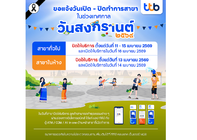ทีทีบี เตรียมสำรองธนบัตร–แจ้งวันหยุดสาขา ช่วงเทศกาลสงกรานต์ ปี 2569