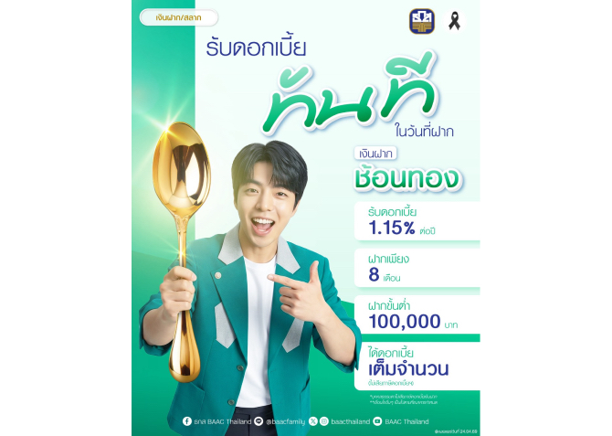 ธ.ก.ส. สร้างทางเลือกทางการเงิน ชวนฝากเงินกับเงินฝากช้อนทอง รับดอกเบี้ยเงินฝากล่วงหน้า ณ วันที่ฝากทันที ร้อยละ 1.15 ต่อปี ระยะเวลาฝาก 8 เดือน ฝากได้ทุกเพศ ทุกวัย ฝากวันไหนก็ได้รับดอกเบี้ย ครบ 8 เดือน ไม่เสียภาษีดอกเบี้ยเงินฝากสำหรับบุคคลธรรมดา และไม่มีค่าธรรมเนียมในการถอนเงินฝากก่อน
