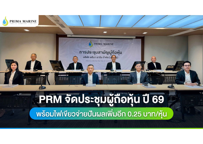 บริษัท พริมา มารีน จำกัด (มหาชน) หรือ PRM ผู้ให้บริการเรือขนส่งและจัดเก็บน้ำมันดิบ ผลิตภัณฑ์น้ำมันสำเร็จรูปและเคมีเหลวทางเรือ และให้บริการเรือสนับสนุนงานสำรวจและผลิตปิโตรเลียมทางชั้นนำของไทย จัดประชุมผู้ถือหุ้นประจำปี 2569 ผ่านสื่ออิเล็กทรอนิกส์ (E-MEETING) โดยที่ประชุมมีมติอนุมัติการจ่ายเงินปันผลจากผลการดำเนินงานประจำปี 2568 เพิ่มเติมอีกในอัตราหุ้นละ 0.25 บาท โดยจ่ายจากกำไรส่วนที่ไม่ได้รับการส่งเสริมการลงทุน (Non-BOI) ทั้งจำนวน