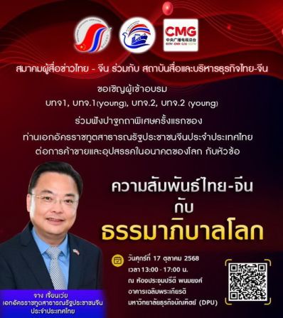 ดร.กำพล กล่าวด้วยว่าสมาคมผู้สื่อข่าวไทย–จีนร่วมกับสถาบันสื่อและบริหารธุรกิจไทย–จีน ขอเชิญเข้าร่วมฟังปาฐกถาพิเศษจากนายจาง เจี้ยนเว่ย (Zhang Jianwei) เอกอัครราชทูตสาธารณรัฐประชาชนจีนประจำประเทศไทย ในหัวข้อ “ความสัมพันธ์ไทย–จีน กับ ธรรมาภิบาลโลก” ซึ่งการปาฐกถาครั้งนี้จะครอบคลุมการวิเคราะห์เชิงลึกเกี่ยวกับพลวัตของความสัมพันธ์ไทย–จีนในบริบทของระเบียบโลกใหม่ รวมถึงบทบาทของธรรมาภิบาลโลกในการรับมือกับความท้าทายด้านการค้า การลงทุน และความร่วมมือด้านต่าง ๆ ที่กำลังเกิดขึ้น ซึ่งเป็นประโยชน์ต่อผู้ประกอบการ นักลงทุน และผู้ที่สนใจในธุรกิจระหว่างประเทศ เพื่อนำข้อมูลเชิงกลยุทธ์ไปปรับใช้ในการดำเนินธุรกิจในยุคโลกเปลี่ยนแปลงอย่างรวดเร็ว นอกจากนี้ นายชิบ จิตนิยม รองประธานคณะกรรมาธิการการต่างประเทศ วุฒิสภา มาร่วมปาฐกถาในหัวข้อ “ธรรมาภิบาลโลก อนาคตแห่งสันติภาพร่วมกัน” ซึ่งเป็นการแลกเปลี่ยนมุมมองเชิงลึกระหว่างนักการทูต นักวิชาการ และภาคสื่อมวลชน