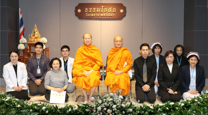 โดยมีพระเทพปฏิภาณกวี (ซ้าย) เจ้าคณะเขตภาษีเจริญ และผู้ช่วยเจ้าอาวาสวัดประยุรวงศาวาสวรวิหารเป็นประธานฝ่ายสงฆ์ และนางประภัสสร รุจิรากรสกุล (แถวหน้า : ที่ 2 จากซ้าย) ประธานเจ้าหน้าที่บริหาร โรงพยาบาลหัวเฉียว พร้อมคณะผู้บริหาร แพทย์ พยาบาล เจ้าหน้าที่ และผู้รับบริการ เข้าร่วมฟังบรรยายธรรมะ อย่างคับคั่ง เมื่อเร็ว ๆ นี้ ณ โรงพยาบาลหัวเฉียว
