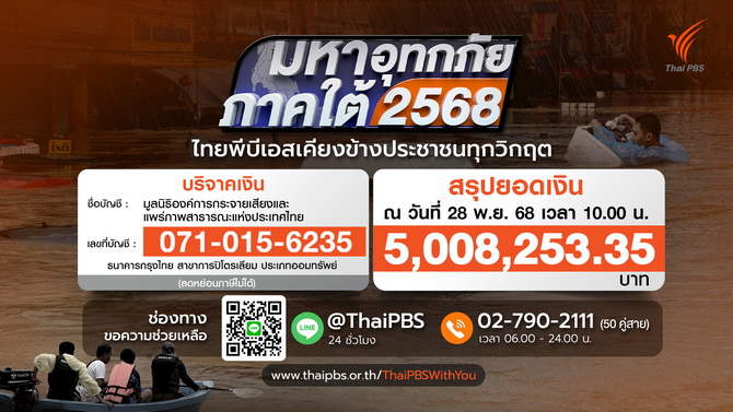 สำหรับยอดเงินบริจาค ณ วันที่ 28 พ.ย.68 เวลา 10.00 น. จำนวน 5,008,253.35 บาทร่วมบริจาคได้ที่ บัญชีธนาคาร: มูลนิธิองค์การกระจายเสียงและแพร่ภาพสาธารณะแห่งประเทศไทย เลขที่บัญชี: 071-015-6235 ธนาคารกรุงไทย สาขาการปิโตรเลียม (ประเภทออมทรัพย์) บริจาคสิ่งของเครื่องอุปโภคบริโภค ได้ที่ ไทยพีบีเอส ถ.วิภาวดีรังสิต (Google maps)