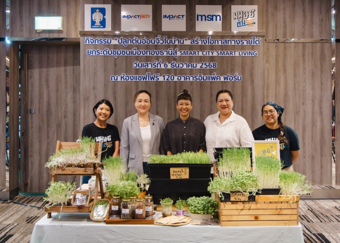คุณประภัสรา นิมมานเทวินทร์ ผู้จัดการทั่วไป บริษัท เมืองทอง เซอร์วิสเซส แอนด์ แมเน็จเม้นท์ จำกัด บริษัทในเครือ บมจ. บางกอกแลนด์ (ลำดับที่ 2 จากซ้าย) คุณจินตนา พงษ์ภักดี ผู้อำนวยการสำนักงานฝ่ายสื่อสารองค์กร บริษัท อิมแพ็ค เอ็กซิบิชั่น แมเนจเม้นท์ จำกัด (ลำดับที่ 2 จากขวา) คุณปูเป้ สุพัตรา ไชยชมภู เจ้าของเพจปูเป้ทำเอง (ลำดับที่ 3 จากขวา) และทีมงานมนุษย์ต่างวัย ร่วมจัดโครงการส่งเสริมความรู้และอาชีพสู่ชุมชน ด้วยการเชิญชวนชาวชุมชนเมืองทองธานีเข้าร่วมกิจกรรม “ปลูกต้นอ่อนจิ๋วในบ้าน สร้างโอกาสทางรายได้” โดยมีผู้สนใจเข้าร่วมกิจกรรมกว่า 80 ท่านณ ห้องแซฟไฟร์ 120 อาคารอิมแพ็ค ฟอรั่ม เมืองทองธานี