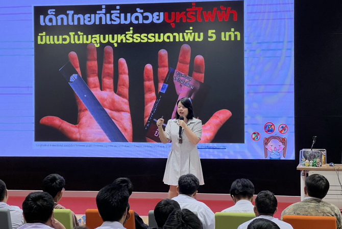 นอกจากนี้ ยังชี้ให้เห็นอันตรายของสารนิโคตินในบุหรี่ไฟฟ้าที่อันตรายกว่าบุหรี่มวนถึง 20 เท่า ส่งผลต่อสมองที่จะถูกทำลายอย่างรวดเร็ว ก่อให้เกิดอาการซึมเศร้า รวมถึงก่อให้เกิดโรค EVALI หรือ โรคปอดอักเสบรุนแรง สุดท้ายนี้ยังย้ำว่าบุหรี่ไฟฟ้าผิดกฎหมาย