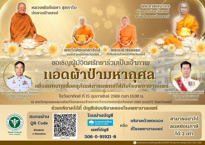 จ.แพร่ - พล.อ.อ.ประจิน จั่นตอง อดีตรองนายกรัฐมนตรี ประธานฝ่ายฆราวาช พร้อมด้วย นายอภิชาติ โตดิลกเวชช์ ที่ปรึกษาประธานเจ้าหน้าที่บริหาร บริษัท ไทยเบฟเวอเรจ จำกัด (มหาชน) (ThaiBev) เป็นเจ้าภาพในพิธี “ทอดผ้าป่ามหากุศลเพื่อโรงพยาบาลแพร่” เมื่อวันที่ 15 กุมภาพันธ์ 2569 ณ หอประชุมล้านนา แยกกอเปา จ.แพร่ เพื่อสมทบทุนจัดซื้อครุภัณฑ์ทางการแพทย์ให้กับโรงพยาบาลแพร่ โดยมีพระเถรานุเถระชั้นผู้ใหญ่ร่วมเป็นประธานฝ่ายสงฆ์นำโดย หลวงพ่อกัณหา สุขกาโม ประธานฝ่ายสงฆ์ พร้อมด้วย พระราชเขมากร เจ้าคณะจังหวัดแพร่ และคณะสงฆ์ในจังหวัด พร้อมด้วยคณะกรรมการพัฒนาโรงพยาบาลแพร่ ตลอดจนผู้มีจิตศรัทธาจำนวนมากเข้าร่วมเป็นเจ้าภาพและร่วมทำบุญอย่างพร้อมเพรียง โดยบรรยากาศภายในงานเป็นไปด้วยความอบอุ่น เปี่ยมด้วยแรงศรัทธา และความตั้งใจอันแน่วแน่ของทุกภาคส่วนที่ร่วมกันสานต่อกุศลเจตนาเพื่อประโยชน์สุขของส่วนรวมอย่างแท้จริง