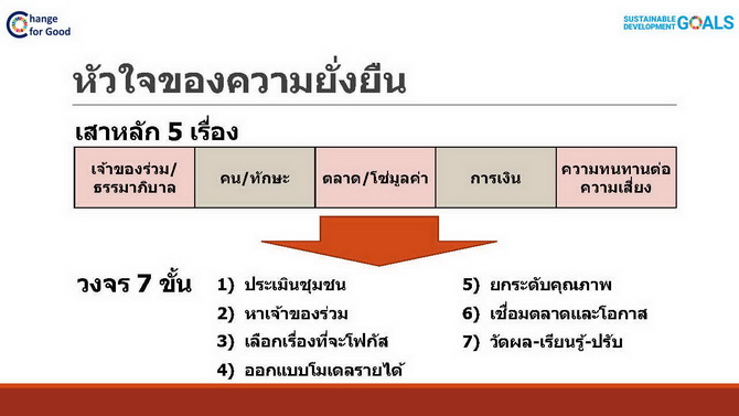 "เศรษฐกิจชุมชน หากเรามองแบบยั่งยืน มันหมายถึงว่า การช่วยให้คนมีความสามารถเลี้ยงตัวเองได้ มีงาน มีรายได้ ตรงนี้คือ รากฐานสำคัญ ซึ่งตรงนี้สอดคล้องกับภารกิจของโรตารี ที่ว่าการช่วยสร้างการเจริญเติบโตให้กับเศรษฐกิจท้องถิ่น เพื่อเป็นทางออกที่ยั่งยืนให้กับความยากจน จากประสบการณ์จะบอกว่า หากเราคิดเริ่มจากสิ่งที่เราอยากทำ หรือลงจากบนสู่ล่าง มากกว่าจากล่างสู่บนหรือสิ่งที่ชุมชนต้องการ โครงการนั่นๆมักจะหยุดลงเมื่อสิ่งงบสนับสนุนหรือคนหลักต้องย้ายออกหรือสิ้นคนหลักไป..”