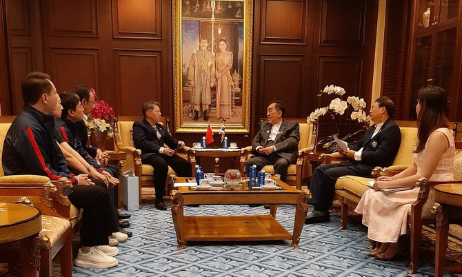 สมาคมผู้สื่อข่าวไทย-จีน นำโดย ดร.กำพล มหานุกูล นายกสมาคม นายซุน กวงหย่ง เลขาธิการสมาคม พร้อมด้วย นางฉาง เทียนถง และนายหลี่ จิงเหล่ย กรรมการบริหารสมาคม เดินทางเข้าพบ ดร.พจน์ อร่ามวัฒนานนท์ ประธานกรรมการหอการค้าไทย และสภาหอการค้าแห่งประเทศไทย พร้อมด้วย นายวิบูลย์ สุภัครพงษ์กุล รองประธานกรรมการหอการค้าไทย เมื่อวันจันทร์ที่ 16 มีนาคม 2569 ณ หอการค้าไทย ถนนราชบพิธ เพื่อหารือเกี่ยวกับแนวทางการขยายความร่วมมือด้านการสื่อสารและการประชาสัมพันธ์ข้อมูลข่าวสารทางเศรษฐกิจระหว่างประเทศไทยและประเทศจีน