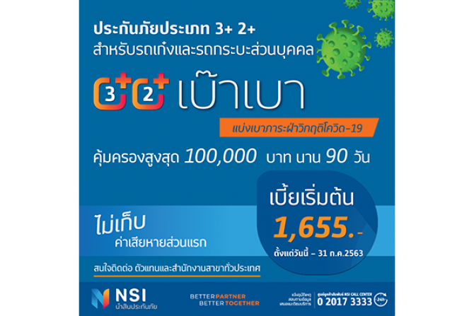 จากสถานการณ์การแพร่ระบาดของไวรัสโควิด-19 ซึ่งส่งกระทบต่อพี่น้องคนไทยที่มีภาระหลายด้าน บริษัท นำสินประกันภัย จำกัด (มหาชน) ขอส่งกำลังใจและร่วมฝ่าวิกฤติเพื่อชีวิตก้าวไกลไปด้วยกัน ด้วยแผนประกันภัยรถยนต์ประเภทพลัส “ 3+ 2+ เบ๊าเบา ” ที่ให้ความคุ้มครองระยะสั้น 90 วัน สำหรับรถเก๋งและรถกระบะส่วนบุคคล สามารถเลือกได้ทั้งแบบประกันชั้น 3+ และ 2+ โดยให้ความคุ้มครองสูงถึง 100,000 บาท และไม่เก็บค่าเสียหายส่วนแรก ด้วยเบี้ยเริ่มต้นเพียง 1,655 บาท เพื่อผ่อนเบาภาระค่าใช้จ่าย ให้ลูกค้าผู้เอาประกันภัยได้เบาใจ มีรถยนต์ใช้ฝ่าวิกฤติโควิด-19 ได้นานถึง 90 วัน ทั้งนี้ เงื่อนไขเป็นไปตามที่บริษัทฯ กำหนด สนใจติดต่อตัวแทนและสำนักงานสาขานำสินประกันภัย 26 แห่งทั่วประเทศได้ตั้งแต่วันนี้ จนถึงวันที่ 31 กรกฎาคม 2563 เท่านั้น