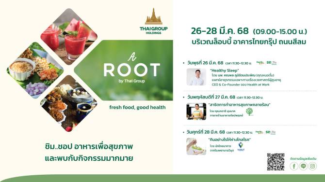 บริษัท ไทยกรุ๊ป โฮลดิ้งส์ จำกัด (มหาชน) กลุ่มธุรกิจประกันและการเงินในเครือทีซีซี ชวนชอปเมนูอร่อยรับซัมเมอร์ทั้งคาวหวาน พร้อมผลิตภัณฑ์เกษตรธรรมชาติ ภายในงาน “A ROOT By Thai Group” คอมมูนิตี้เพื่อการดูแลสุขภาพ ที่จะเป็นรากฐานด้านอาหารและเสริมสร้างสุขภาวะที่ดีทั้งกายและใจ เตรียมพบกับผลิตภัณฑ์คุณภาพที่คัดสรรมาเป็นพิเศษ โดยเฉพาะเมนูอาหารเป็นยา ที่จะสร้างการรับรู้และเผยแพร่ความมหัศจรรย์ของอาหารไทย รสชาติเป็นที่ยอมรับไปทั่วโลก และมีประโยชน์กับสุขภาพ อาทิ ข้าวแช่ เมี่ยงคำ ข้าวยำสมุนไพร เป็นต้น พร้อมเติมเต็มความสดชื่นคลายร้อนกับหลากหลายเมนู นอกจากนี้ ยังมีกิจกรรมเกี่ยวกับสุขภาพที่น่าสนใจ ได้แก่ วันที่ 26 มีนาคม 2568 พบกับ Health Talk หัวข้อ “Healthy Sleep” จาก นพ.คณพล ภูมิรัตนประพิณ (หมอตั้ม) แพทย์อายุรกรรมเฉพาะทางเรื่องเวชศาสตร์ผู้สูงอายุ CEO & Co-Founder ของ Health at Work วันที่ 27 มีนาคม 2568 พบกับการสาธิตทำอาหารสุขภาพคลายร้อน โดย นางภดารี บุนนาค ทายาทร้านอาหารครัวกัลปพฤกษ์ และวันที่ 28 มีนาคม 2568 พบกับนักโภชนาการจากโรงพยาบาลวิมุต ที่จะมาให้ความรู้ในหัวข้อ “กินอย่างไรให้ห่างไกลโรค” ทั้งนี้ งานจัดขึ้นระหว่างวันที่ 26 -28 มีนาคม 2568 ตั้งแต่เวลา 09.00-15.00 น. ณ บริเวณ Lobby อาคารไทยกรุ๊ป สำนักงานใหญ่ ถนนสีลม