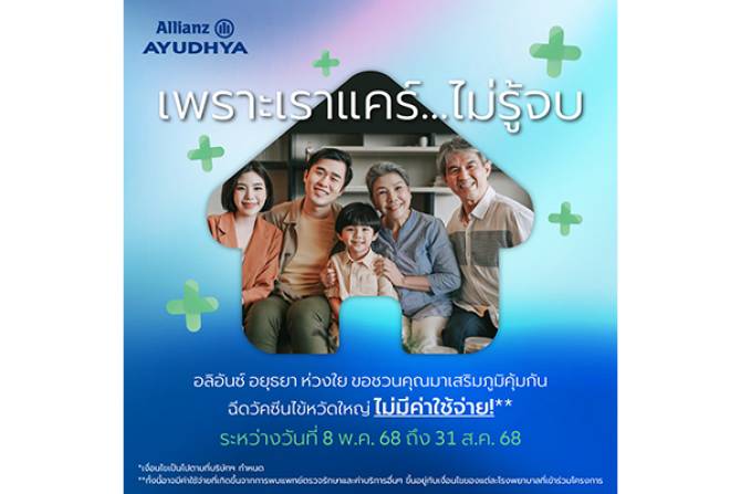 อลิอันซ์ อยุธยา ส่งความห่วงใยไม่รู้จบ ให้ลูกค้าคนสำคัญเพิ่มภูมิคุ้มกันและลดโอกาสในการติดเชื้อไข้หวัดใหญ่ที่มักจะระบาดในช่วงฤดูฝน มอบวัคซีนป้องกันโรคไข้หวัดใหญ่ โดยไม่มีค่าใช้จ่าย ให้กับลูกค้าอลิอันซ์ อยุธยา ประกันชีวิต กลุ่มเสี่ยง ตั้งแต่ เด็กอายุ 0-15 ปี และผู้ใหญ่ที่มีอายุมากกว่า 60 ปีขึ้นไป โดย ลูกค้า อลิอันซ์ อยุธยา ประกันชีวิต และ อลิอันซ์ อยุธยา ประกันภัย (เฉพาะที่มีกรมธรรม์ประกันสุขภาพ) จะได้รับ SMS และอีเมล ที่บริษัทฯจัดส่งให้เพื่อรับสิทธิ์กับโรงพยาบาลที่เข้าร่วมโครงการ ตั้งแต่วันที่ 8 พฤษภาคม ถึง 31 สิงหาคม 2568 หากไม่ได้รับ SMS ที่บริษัทฯ จัดส่งให้ ลูกค้าประกันชีวิต ติดต่อแผนกลูกค้าสัมพันธ์ ตลอด 24 ชั่วโมง เบอร์โทรติดต่อ 1373