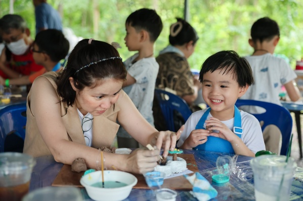 สำหรับช่วงบ่าย เริ่มต้นด้วย ฐานที่ 3 “มัดย้อม ใส่ใจ สีสันจากธรรมชาติ” โดยนำสีจากธรรมชาติมาสร้างสรรค์ลวดลายลงบนผืนผ้า ฝึกการคิด สังเกตและสร้างจินตนาการ ฐานที่ 4 “ปั้นด้วยใจ ใส่ใจ ทุกก้อนดิน” อีกหนึ่งช่วงเวลาคุณภาพ ความสุข ความอบอุ่นในครอบครัว ทุกคนร่วมกันสร้างชิ้นงานจากดินเหนียว ช่วยกันลงสี สร้างพัฒนาการการใช้นิ้วมือ การสัมผัส สร้างสรรค์ผลงานตามจินตนาการ และปิดท้าย ฐานที่ 5 “พายไปด้วยกัน ใส่ใจ ไปพร้อมกัน” กิจกรรมว่ายน้ำและพายเรือแพในบ่อน้ำธรรมชาติ ให้เด็กๆ เรียนรู้ในการคอยช่วยเหลือดูแลกัน ไม่ว่าจะเป็นการส่งไม้พาย ช่วยประคองเรือ หรือกระโดดเล่นน้ำกันอย่างสนุกสนาน