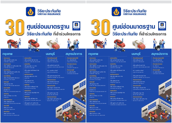 สำหรับศูนย์ซ่อมมาตรฐานวิริยะประกันภัยที่เข้าร่วมโครงการให้บริการตรวจรถฟรี จำนวน 30 แห่ง ได้แก่ 1) อู่ร่วมมิตรการาจ 2) บจ.นิวเพื่อนยนต์ 3) บจ.ไทยรัตน์ยานยนต์ 4) หจก. งามวงศ์วาน คาร์แคร์ 5) บจ.อู่นำชัย รัตนาธิเบศร์ 6) บจ.เซอร์กิต ติวานนท์ 7) บจ.อู่นำชัย เตาปูน (สาขาติวานนท์) 8) บจ.เจริญกิจ ราชพฤกษ์ 9) บจ.เจริญกิจ ออโต้ เซอร์วิส 10) บจ. คุงการาจ 11) บจ.เซอร์กิตบริการ 12) บจ.อู่กังวานชัยการช่าง 13) บจ.อู่วิชัยยนต์ 14) บจ.เทวินทร์ คาร์เซ็นเตอร์ 15) อู่บอส 888 การาจ 16) บจ.ธนพัฒน์ ออโต้ เซ็นเตอร์ 17) บจ.เพอร์เฟคท์ สปีด ไลน์ 18) บจ.เอส ซี ซี 65 การาจ 19) หจก. เจดีย์ออโต้เซอร์วิส 20) หจก.เป้งการาจ 21) บจ. อู่ เอส.เอส. อินเตอร์กรุ๊ป 22) บจ.รุ่งเจริญ บอดี้ คลีนิค 23) บจ.สุขุมวิท เอ.ที. เซอร์วิส 24) หจก.สุทินคาร์เซอร์วิส 25) บจ.เฮงบอดี้คาร์ เซอร์วิส 26) บจ.วงษ์ศิริเลิศ คาร์ เซอร์วิส (1997) 27) บจ.เจริญภัณฑ์ยนตรกิจ เซอร์วิส 28) บจ.นที อินเตอร์เซอร์วิส สาขา 1 29) บจ.อู่แม่กลอง 30) บจ.อ.พิพัฒน์ยนต์ (1989)