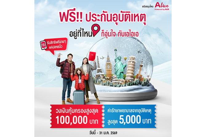 เอไอเอ ประเทศไทย ร่วมมือกับ เอ ไลฟ์ โดยบริษัท เอไอเอ เวลเนส จำกัด ส่งความห่วงใยถึงคนไทยทั่วประเทศในช่วงเทศกาลส่งท้ายปีเก่าต้อนรับปีใหม่ 2569 มอบแคมเปญ “ฟรี!!! ประกันอุบัติเหตุ กรมธรรม์ประกันภัยอุ่นใจข้ามปี” โดยมอบกรมธรรม์ประกันภัยกลุ่มปีใหม่ (ไมโครอินชัวรันส์) ฟรีให้แก่ประชาชนทั่วไป ระยะเวลาคุ้มครองนาน 30 วัน ด้วยวงเงินคุ้มครองชีวิตสูงถึง 100,000 บาทต่อกรมธรรม์ กรณีเสียชีวิตจากอุบัติเหตุ พร้อมรับผลประโยชน์ค่ารักษาพยาบาลเนื่องจากอุบัติเหตุตามจำนวนที่จ่ายจริงสูงสุด 5,000 บาท* เพื่อส่งเสริมให้คนไทยมีหลักประกันความคุ้มครองอุบัติเหตุในช่วงเทศกาลปีใหม่ พร้อมเพิ่มความอุ่นใจสำหรับการวางแผนเดินทางท่องเที่ยวหรือกลับภูมิลำเนาเพื่อไปฉลองกับครอบครัว ซึ่งแคมเปญดังกล่าวยังเป็นการขานรับนโยบายของสำนักงานคณะกรรมการกำกับและส่งเสริมการประกอบธุรกิจประกันภัย (คปภ.) อีกทั้งยังสานต่อพันธกิจของเอไอเอที่ต้องการสนับสนุนให้ผู้คนกว่าพันล้านคนมีสุขภาพและชีวิตที่ดีขึ้น ตามคำมั่นสัญญา Healthier, Longer, Better Lives