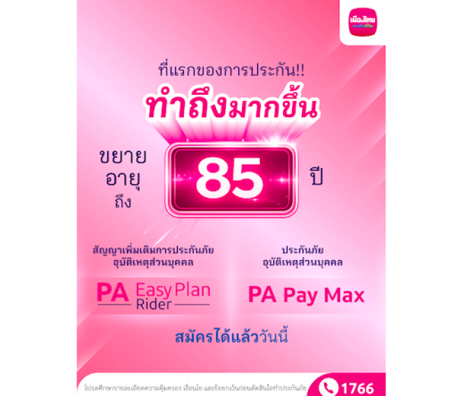 PA Easy Plan Rider สัญญาเพิ่มเติมเพื่อความยืดหยุ่น ให้ผู้เอาประกันสามารถ “เลือก–ปรับ–เพิ่ม” ความคุ้มครองได้ตามความต้องการ ครอบคลุม เงินชดเชยกรณีเสียชีวิต ทุพพลภาพถาวรสิ้นเชิง หรือสูญเสียอวัยวะจากอุบัติเหตุ พร้อม ค่ารักษาพยาบาลจากอุบัติเหตุ และสามารถเลือกซื้อ บันทึกสลักหลังขยายความคุ้มครองในวันหยุดนักขัตฤกษ์ เพื่อเพิ่มวงเงินคุ้มครองเป็น 2 เท่า ในวันที่มีความเสี่ยงสูง อีกทั้งยังให้ความคุ้มครอง ทั่วโลกตลอด 24 ชั่วโมง และเปิดรับผู้เอาประกันตั้งแต่อายุ 30 วัน ถึง 85 ปี เหมาะสำหรับการออกแบบแผนความคุ้มครองให้สอดคล้องกับทุกช่วงชีวิต