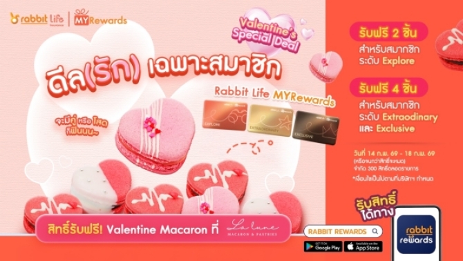 ให้เทศกาลแห่งความรักปีนี้ หวานละมุนกว่าที่เคย โดยสมาชิก Rabbit Life MYRewards สามารถกดรับสิทธิ์แลกของขวัญผ่านแอปฯ Rabbit Life MYRewards ได้ตั้งแต่วันที่ 14–18 กุมภาพันธ์ 2569 (สิทธิ์มีจำนวนจำกัด)