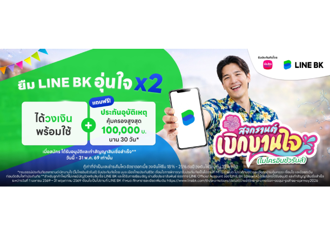นายธนา โพธิกำจร ประธานเจ้าหน้าที่บริหาร บริษัท กสิกร ไลน์ จำกัด กล่าวว่า LINE BK ต้องการอยู่เคียงข้างลูกค้าในทุกช่วงเวลาสำคัญของชีวิต ไม่ว่าจะเป็นการจัดการเรื่องเงินในชีวิตประจำวัน หรือการดูแลความเสี่ยงจากเหตุไม่คาดคิด ในช่วงเทศกาลสงกรานต์ปีนี้ จึงร่วมมือกับพันธมิตรอย่างเมืองไทยประกันชีวิต จัดแคมเปญ “สินเชื่อ LINE BK อุ่นใจ x2” มอบกรมธรรม์ประกันภัยอุบัติเหตุให้กับลูกค้าสินเชื่อ LINE BK ฟรี สำหรับลูกค้าใหม่ที่สมัคร ได้รับอนุมัติและทำสัญญาสินเชื่อสำเร็จ ตั้งแต่วันที่ 1 เมษายน 2569–31 พฤษภาคม 2569 (จำนวน 10,000 สิทธิ์) เพื่อเพิ่มความอุ่นใจในการเดินทางไม่ว่าจะท่องเที่ยวหรือกลับภูมิลำเนา