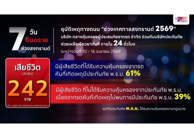 ตามที่ศูนย์อำนวยการป้องกันและลดอุบัติเหตุทางถนน ได้สรุปสถิติอุบัติเหตุทางถนนในช่วงเทศกาลสงกรานต์ 2569 ตลอด 7 วัน ระหว่างวันที่ 10-16 เมษายน 2569 พบว่ามีการเกิดอุบัติเหตุ รวม 1,242 ครั้ง ผู้เสียชีวิต 242 ราย ผู้บาดเจ็บ 1,200 คน โดยสาเหตุหลักที่ทำให้เกิดอุบัติเหตุ ได้แก่ ขับรถเร็วเกินกว่ากฎหมายกำหนด,ดื่มแล้วขับ และรถจักรยานยนต์เป็นพาหนะที่เกิดอุบัติเหตุสูงสุดถึงร้อยละ 68.70