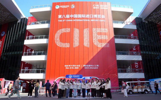 (แฟ้มภาพซินหัว : ผู้คนถ่ายภาพหมู่ที่ศูนย์การประชุมและนิทรรศการแห่งชาติ (เซี่ยงไฮ้) ซึ่งเป็นสถานที่หลักสำหรับจัดงานมหกรรมสินค้านำเข้านานาชาติจีน ครั้งที่ 8 ในเทศบาลนครเซี่ยงไฮ้ทางตะวันออกของจีน วันที่ 10 พ.ย. 2025)
