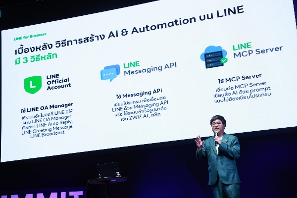 โดยเบื้องหลังของการสร้างระบบ AI และ Automation บน LINE สามารถทำได้ 3 วิธี ได้แก่ 1) LINE OA Manager ที่เต็มไปด้วยฟีเจอร์ ฟังก์ชันมากมาย เช่น ระบบตอบกลับอัตโนมัติที่สามารถตั้งค่าการตอบกลับได้ตาม Keyword ของผู้ใช้ เหมาะสำหรับองค์กรที่ต้องการสร้างคำตอบพื้นฐานอัตโนมัติอย่างง่าย 2) LINE Messaging API เทคโนโลยีตัวกลางเพื่อเชื่อมต่อ server หรือฐานข้อมูลขององค์กร หน่วยงานเข้ากับ LINE Official Account โดยจำเป็นต้องมีบุคลากรด้านไอทีในการเขียนโปรแกรมเพื่อสร้างบริการที่ต้องการได้ เหมาะสำหรับหน่วยงานที่ต้องการพัฒนาการสื่อสาร บริการที่มีความเฉพาะทาง เช่น การส่งข้อมูลหรือสื่อสารเฉพาะรายบุคคล หรือตัวอย่างจากภาคธุรกิจ เช่น แจ้งเตือนยอดเงินเข้า-ออก การจองห้องพัก เป็นต้น 3) LINE Bot MCP Server เทคโนโลยีตัวกลางที่ใช้เชื่อมต่อกับ AI Agent ต่าง ๆ เช่น Claude, Gemini เข้ากับLINE Official Account ของหน่วยงาน ทำให้หน่วยงานหรือองค์กรสามารถสั่งงาน AI ให้ช่วยดึงข้อมูลรวมถึงช่วยทำการสื่อสารผ่าน LINE Official Account ให้ได้ด้วย Prompt โดยไม่ต้องเขียนโปรแกรม