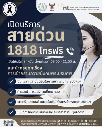 บริษัท โทรคมนาคมแห่งชาติ จำกัด (มหาชน) หรือ NT ร่วมกับ กรุงเทพมหานคร และสำนักงานคณะกรรมการกิจการกระจายเสียง กิจการโทรทัศน์ และกิจการโทรคมนาคมแห่งชาติ (กสทช.) เปิดให้บริการ หมายเลขโทรศัพท์สายด่วน “1818” เพื่ออำนวยความสะดวกแก่ประชาชนในการสอบถามและขอคำแนะนำเรื่องการเข้ากราบถวายบังคมพระบรมศพ น้อมรำลึกในพระมหากรุณาธิคุณอันหาที่สุดมิได้